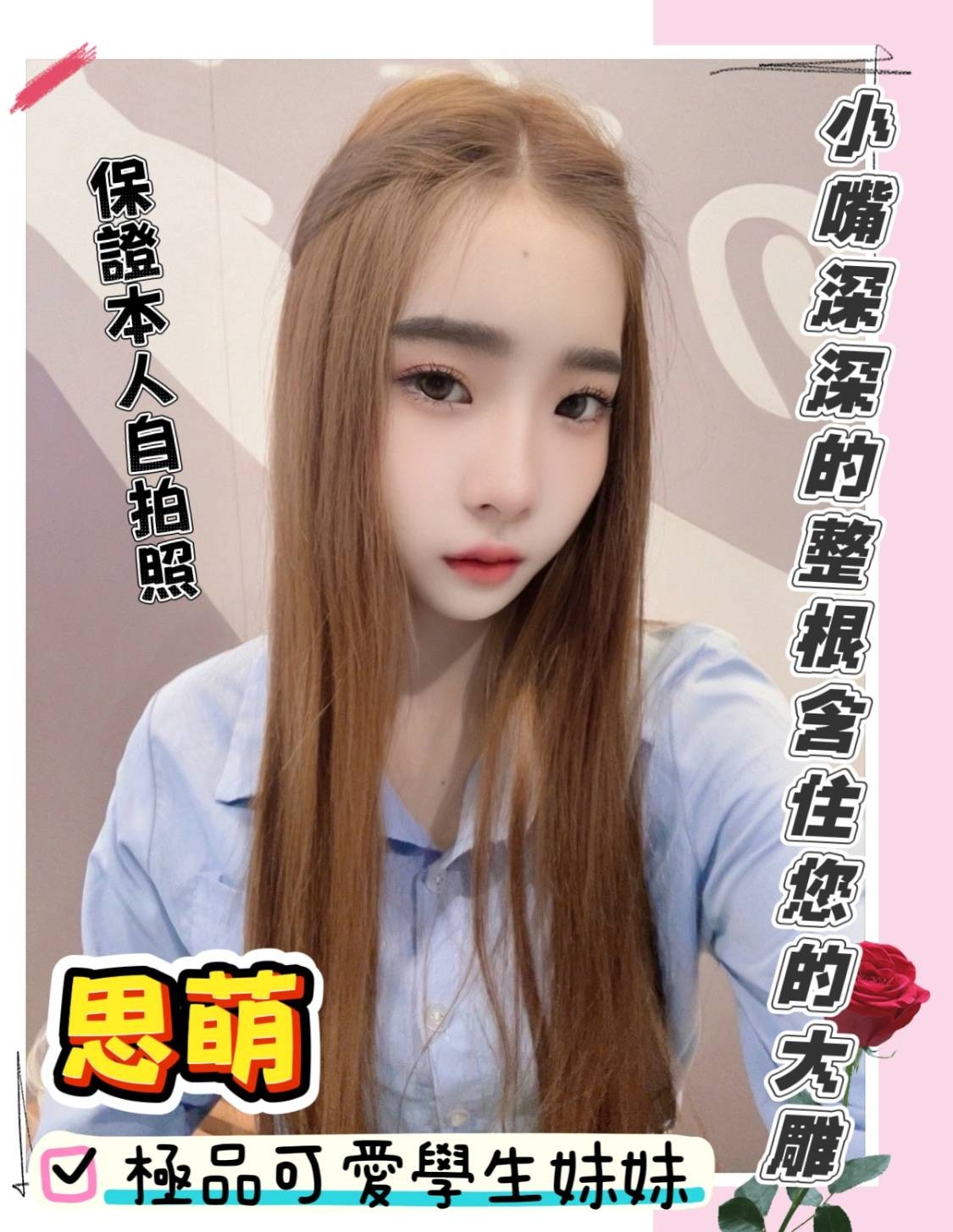 無套吹/69/品鮑/舔蛋/奶炮/胸/屁推/共/按/水中蕭/深喉嚨/絲襪(需自備)/角色扮演(需自備)