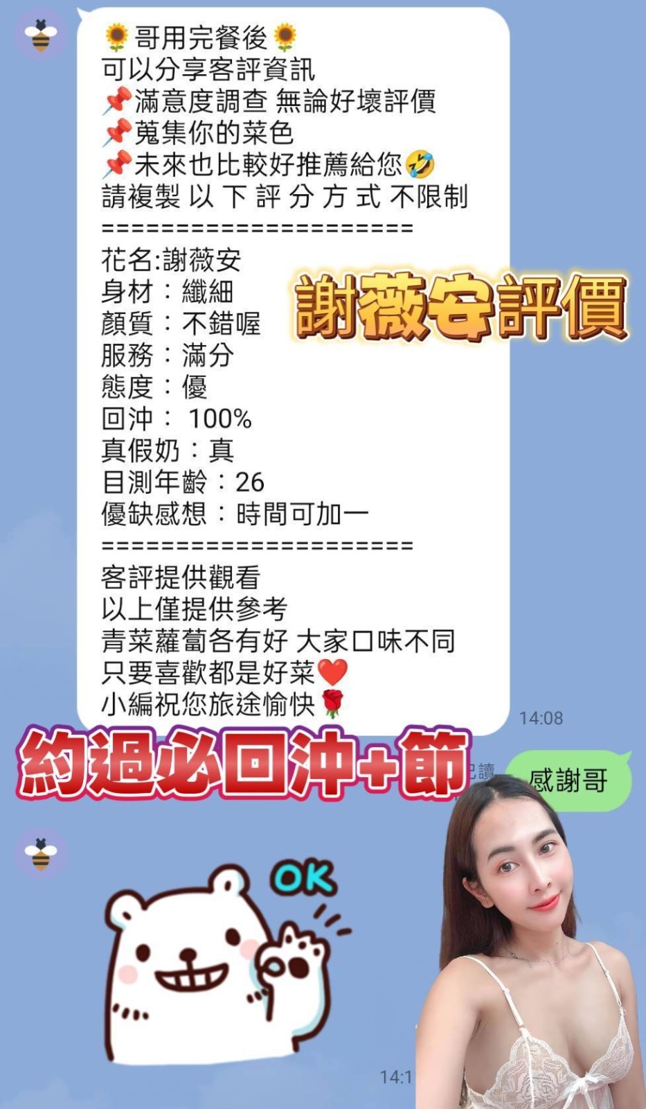 色情共浴/無套吹/小親親/舌吻(視口腔衛生)/奶泡/胸推/臀推/屁推/69/品鮑/按摩/全套愛愛/毒龍(需事先告知)